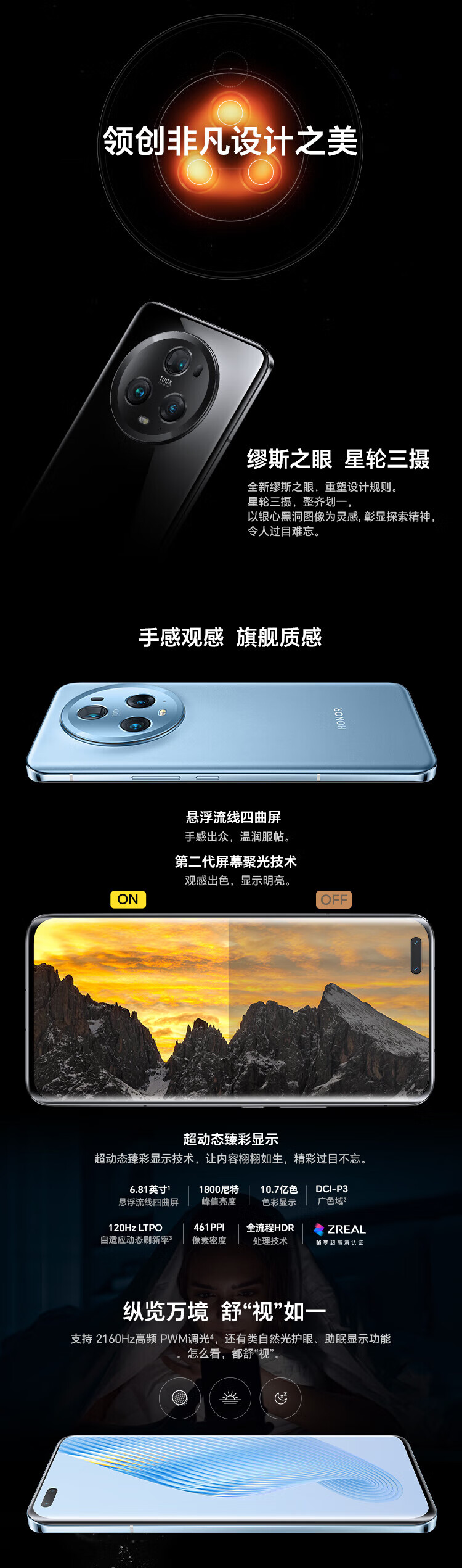 商品名稱(chēng):榮耀Magic5 Pro 榮耀青海湖電池 鷹眼相機 高通驍龍8Gen2 懸浮流線(xiàn)四曲屏 5G手機 16GB+512GB 勃朗藍