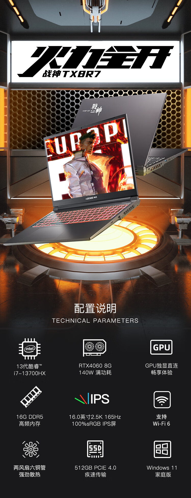 商品名稱(chēng):神舟(HASEE)戰神TX8R7 13代英特爾酷睿i7 16英寸游戲本 筆記本電腦(i7-13700HX 16G 512G RTX4060 165Hz 2.5K電競屏)