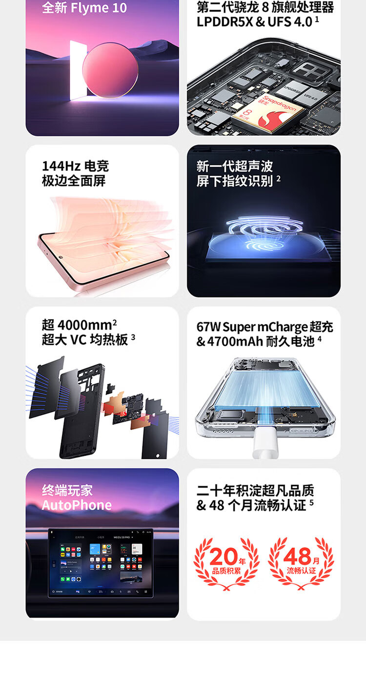 魅族 20 12GB+256GB 定勝青 第二代驍龍8旗艦芯片 144Hz電競直屏 支持67W快充 超薄機身設計 5G手機