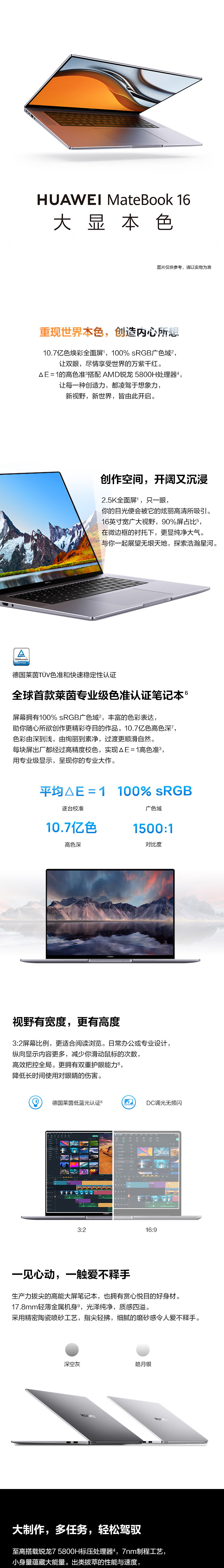 商品名稱(chēng):華為MateBook 16 輕薄高性能辦公筆記本 16英寸2.5K全面屏(銳龍標壓R7-5800H 16G 512G 高色準多屏協(xié)同) 灰