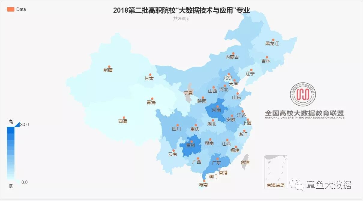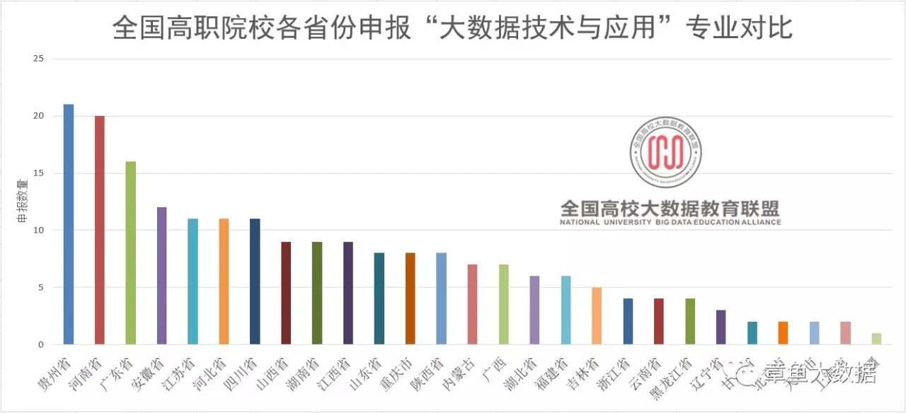 從圖中可以看出申報“大數據技術(shù)與應用”專(zhuān)業(yè)的省份數量前三為貴州、河南、廣東,申報數量較少的是北京、天津、上海、新疆。