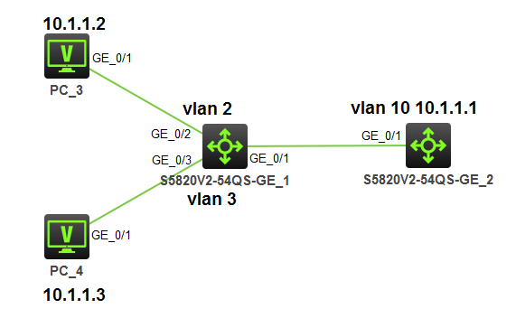 交換機SW上G1/0/2和G1/0/3連接用戶(hù)的PC3和PC4,分別劃分vlan2和vlan3作為secondary vlan之后進(jìn)行用戶(hù)相互隔離,配置G1/0/1為vlan 10,作為primary vlan。